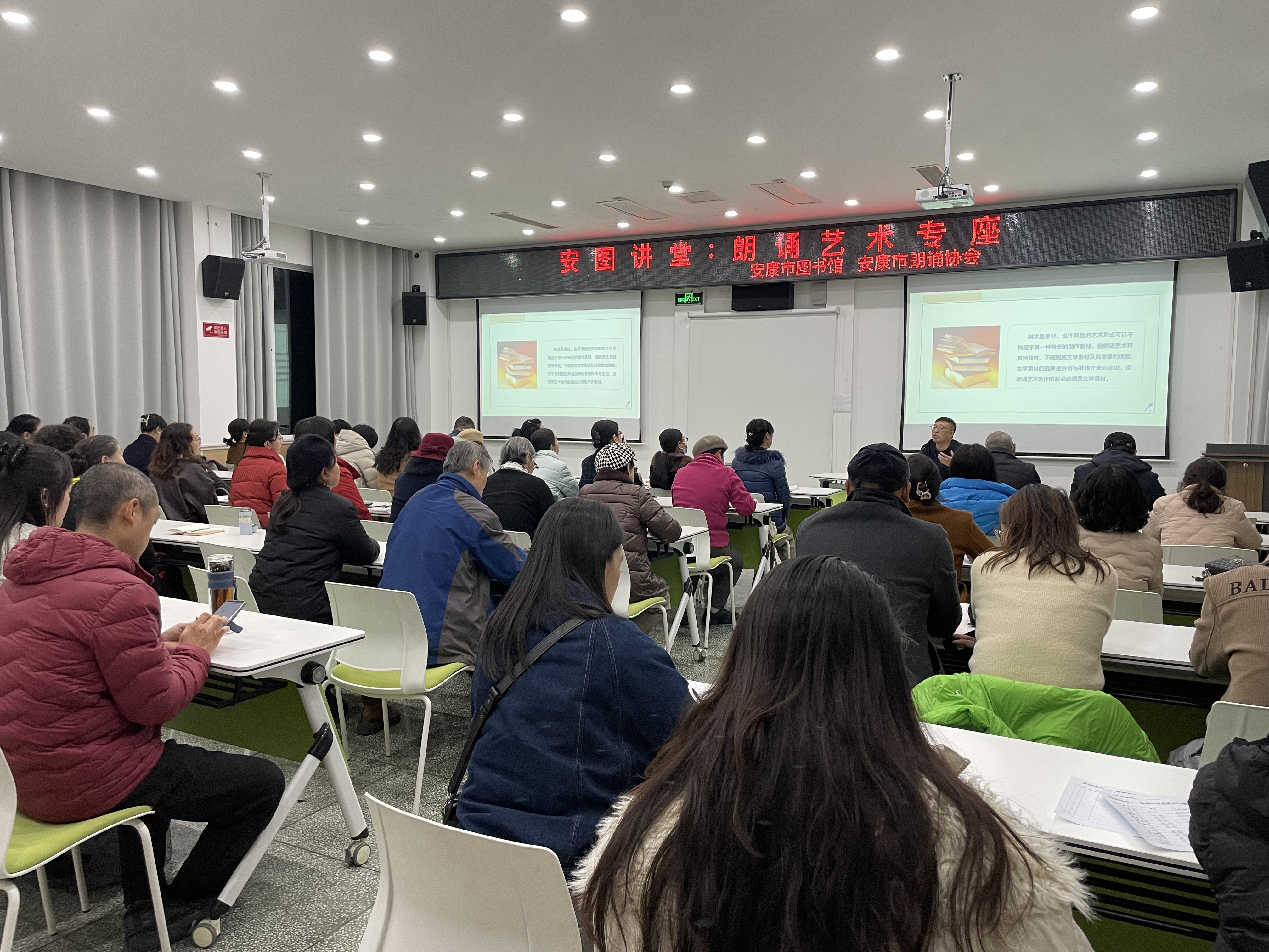 11月28日,由安康市图书馆、安康市朗诵协会共同举办的朗诵专题讲座在安康市图书馆多功能厅开展,吸引了60余名读者参加。