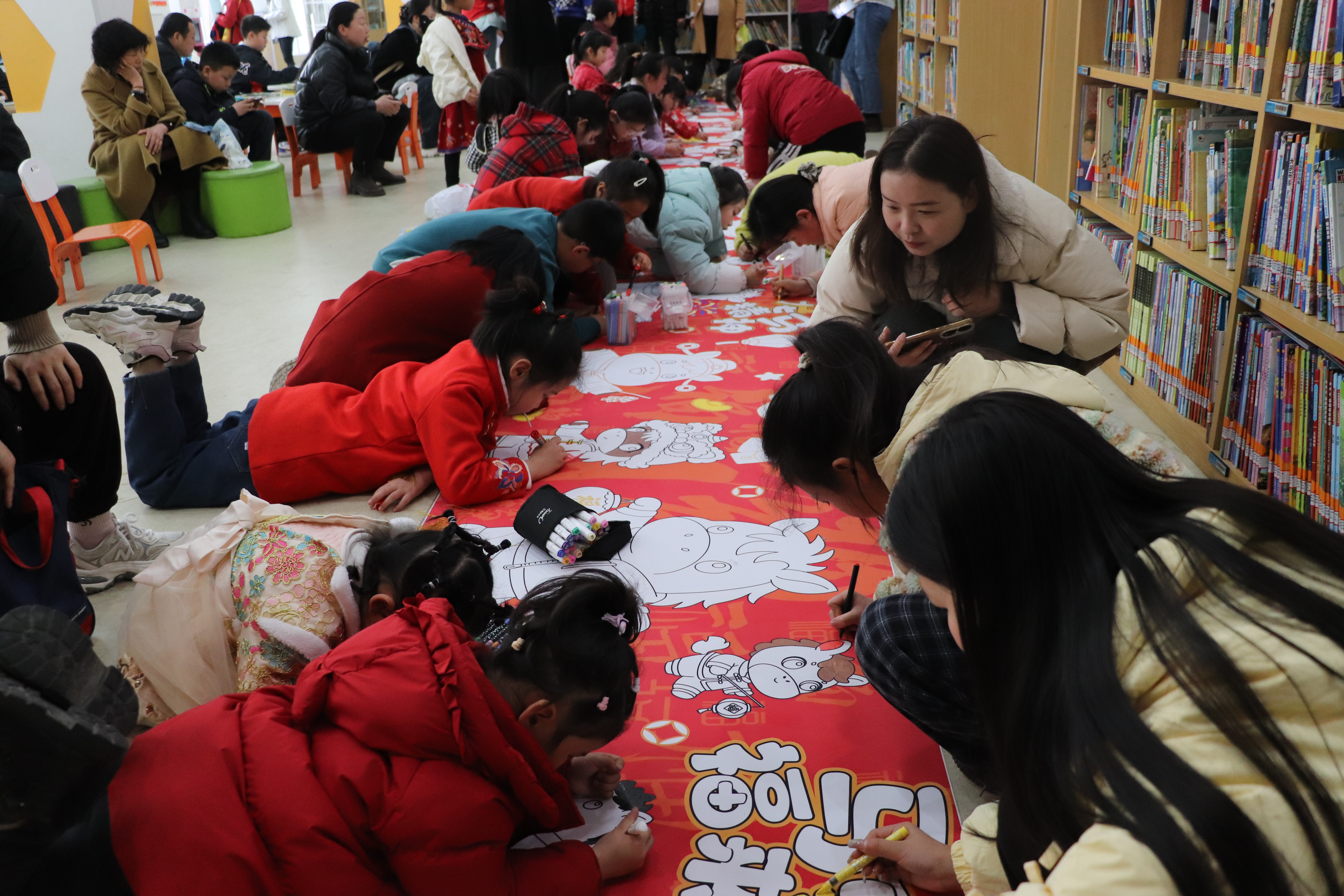 紧随其后的“共绘百米画卷”环节,将活动推向另一番温情景象。在绘本阅览区,40个小朋友身着喜庆服饰,以图书馆提供的画卷为基底,用自备的画笔尽情挥洒。小读者们化身“小画家”,将心中对马年新春的美好想象、对元宵团圆的温暖祝愿,转化为一幅幅生动斑斓的图画。稚嫩的笔触与纯真的创意描绘出马年的勃勃生机,传递出对新春最诚挚的祝福。