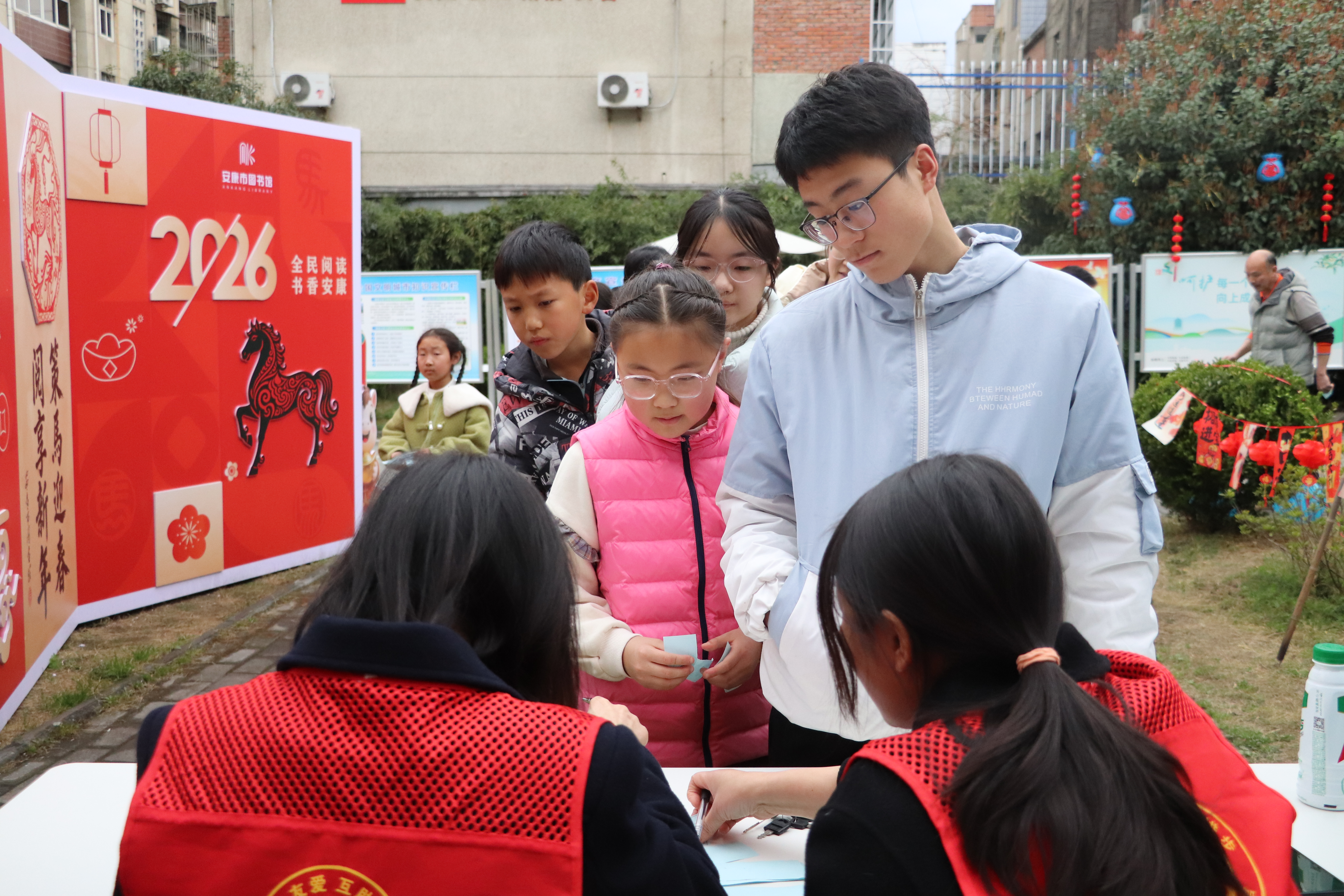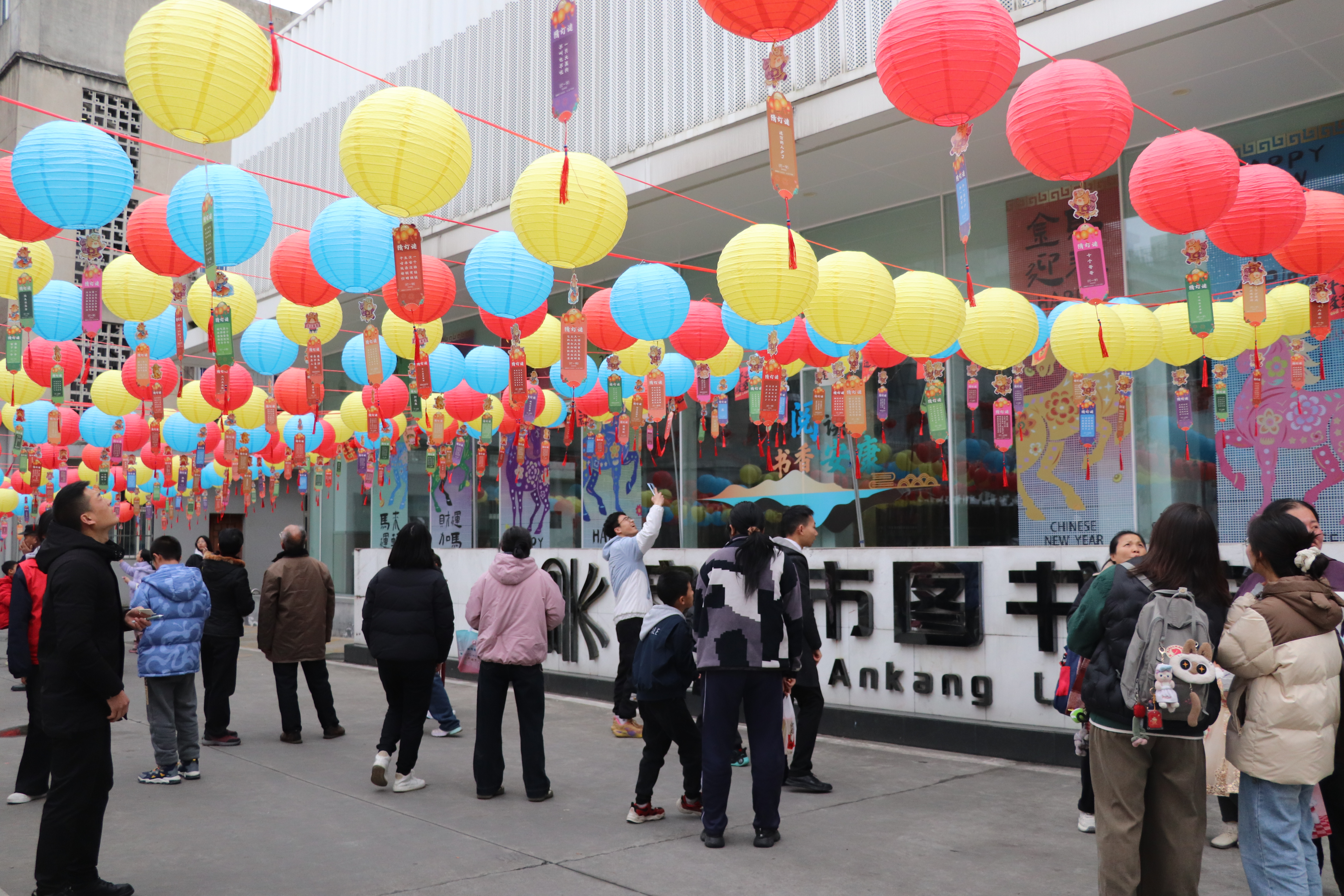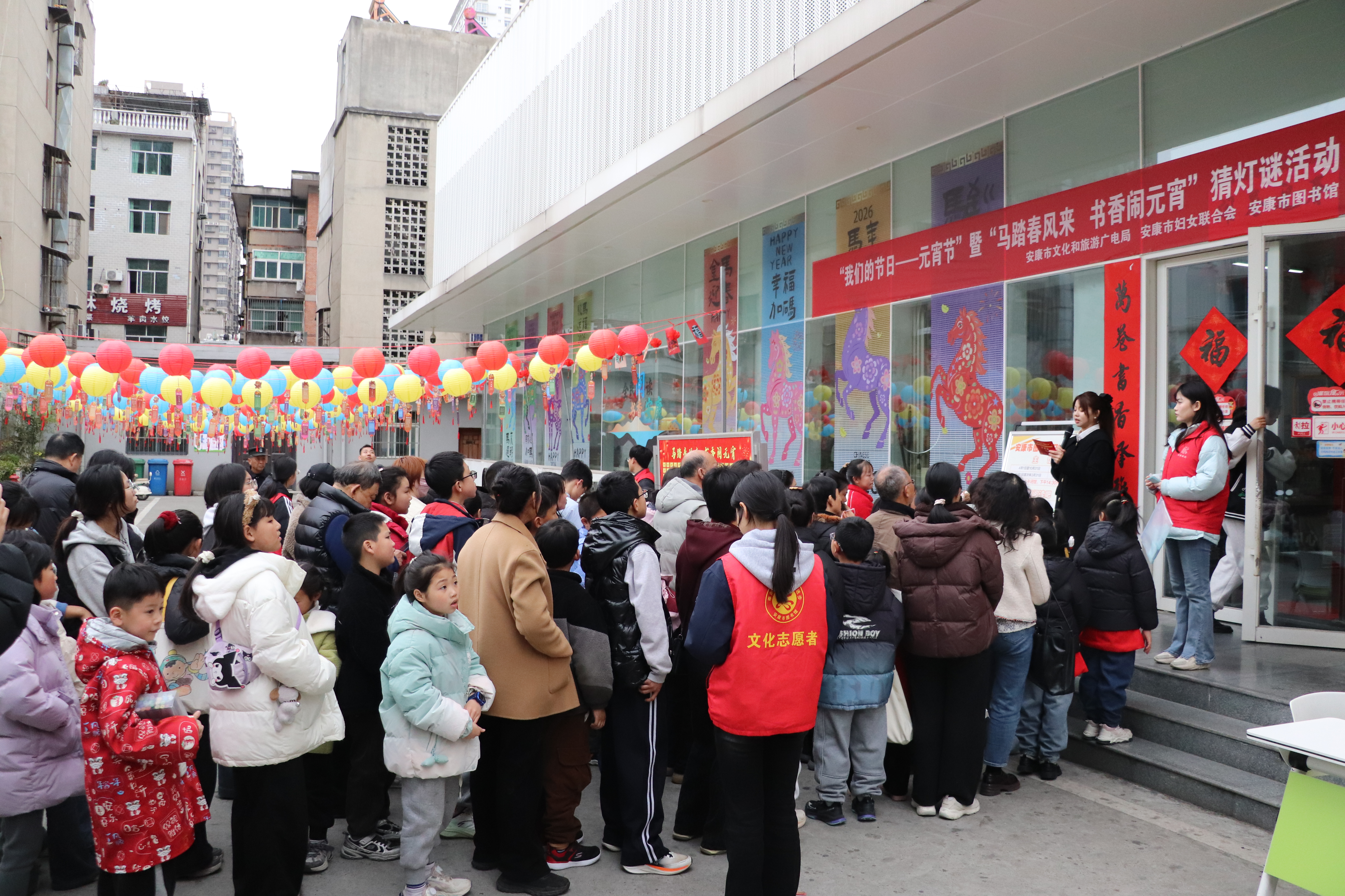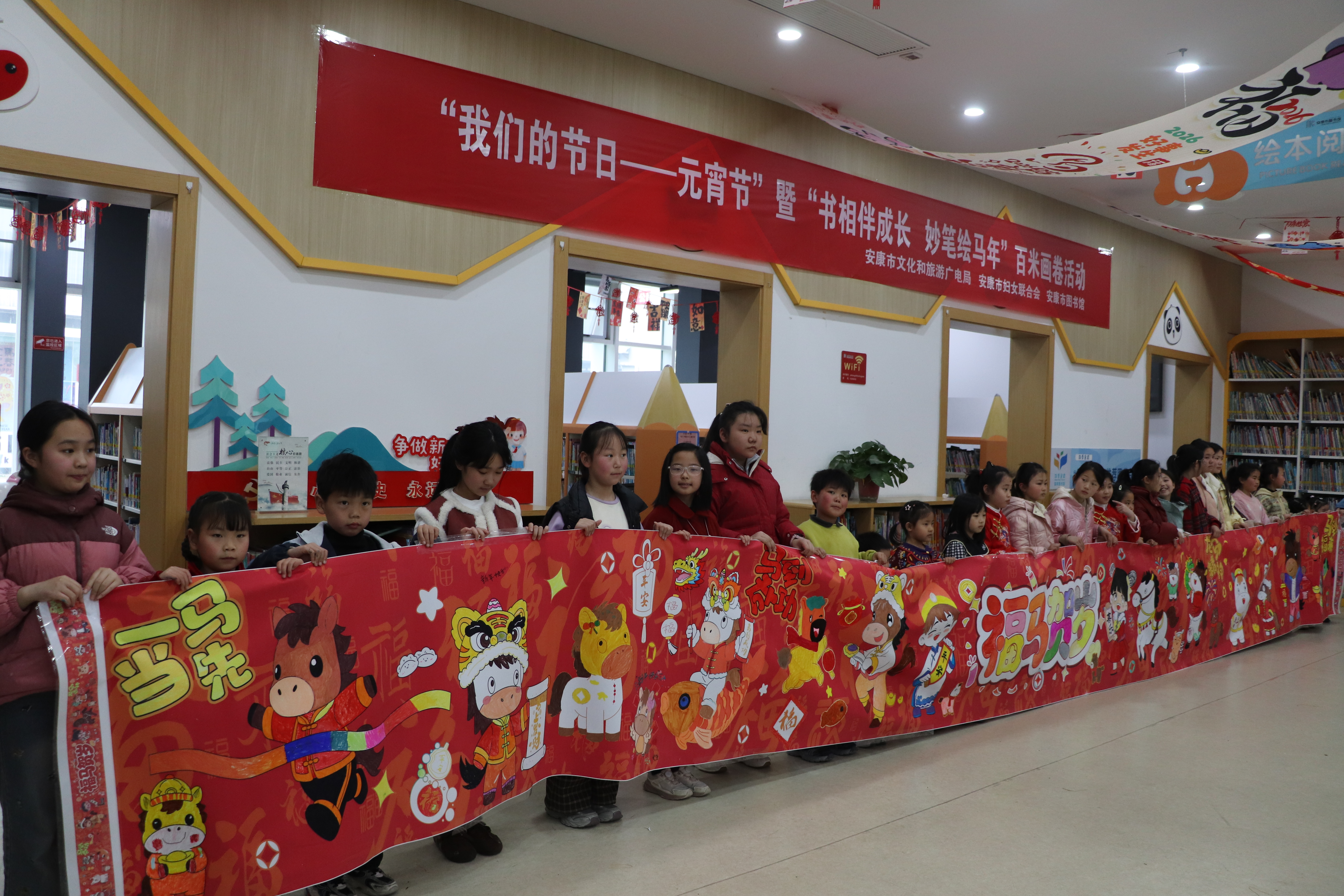 农历丙午马年正月十四(2026年3月2日)下午,安康市图书馆内张灯结彩,书香与笑语交融。由安康市文化和旅游广电局、安康市妇女联合会主办,安康市图书馆承办的“马踏春风来,书香闹元宵”系列活动圆满举办,数百名读者朋友欢聚在图书馆院内,在浓郁的文化氛围中度过了一个温馨喜庆、别开生面的元宵佳节。本次活动旨在弘扬优秀传统文化,丰富市民读者精神文化生活,助力“书香安康”建设。现场精心设计了“趣味猜灯谜”与“共绘百米画卷,妙笔绘马年”两大主题活动,将传统节俗与图书馆的阅读、美育功能巧妙结合。